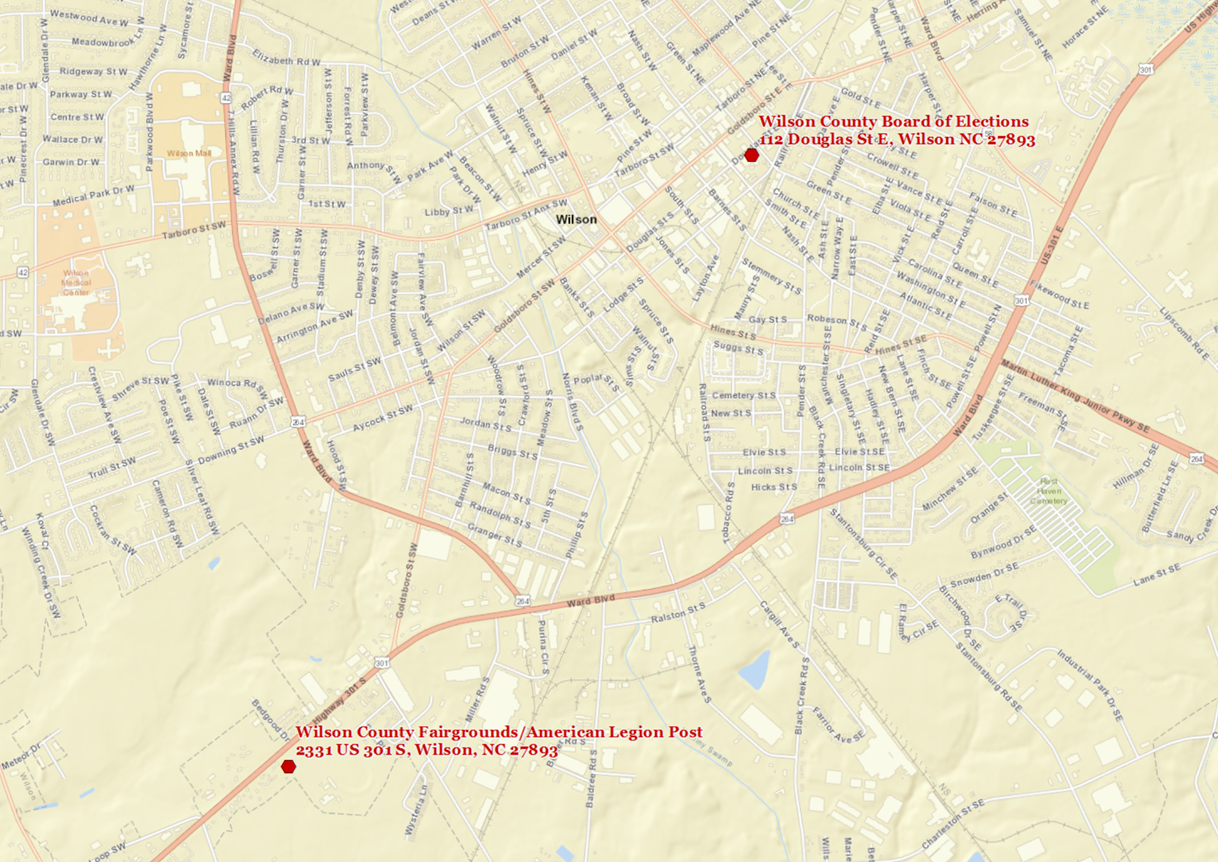 Please note that this report provides voting recinct information for an entire tax parcel. If a parcel is overlapping in more than one precinct, more than one precinct option may be shown. For more information please contact the Wilson County Board of Elections at (252) 399-2836 or email at elections@wilson-co.com